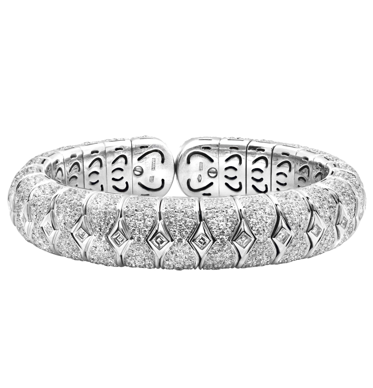 Buccellati Italy 18K White Gold Diamond Wide Cuff Bangle with Hand-Engraved Finish