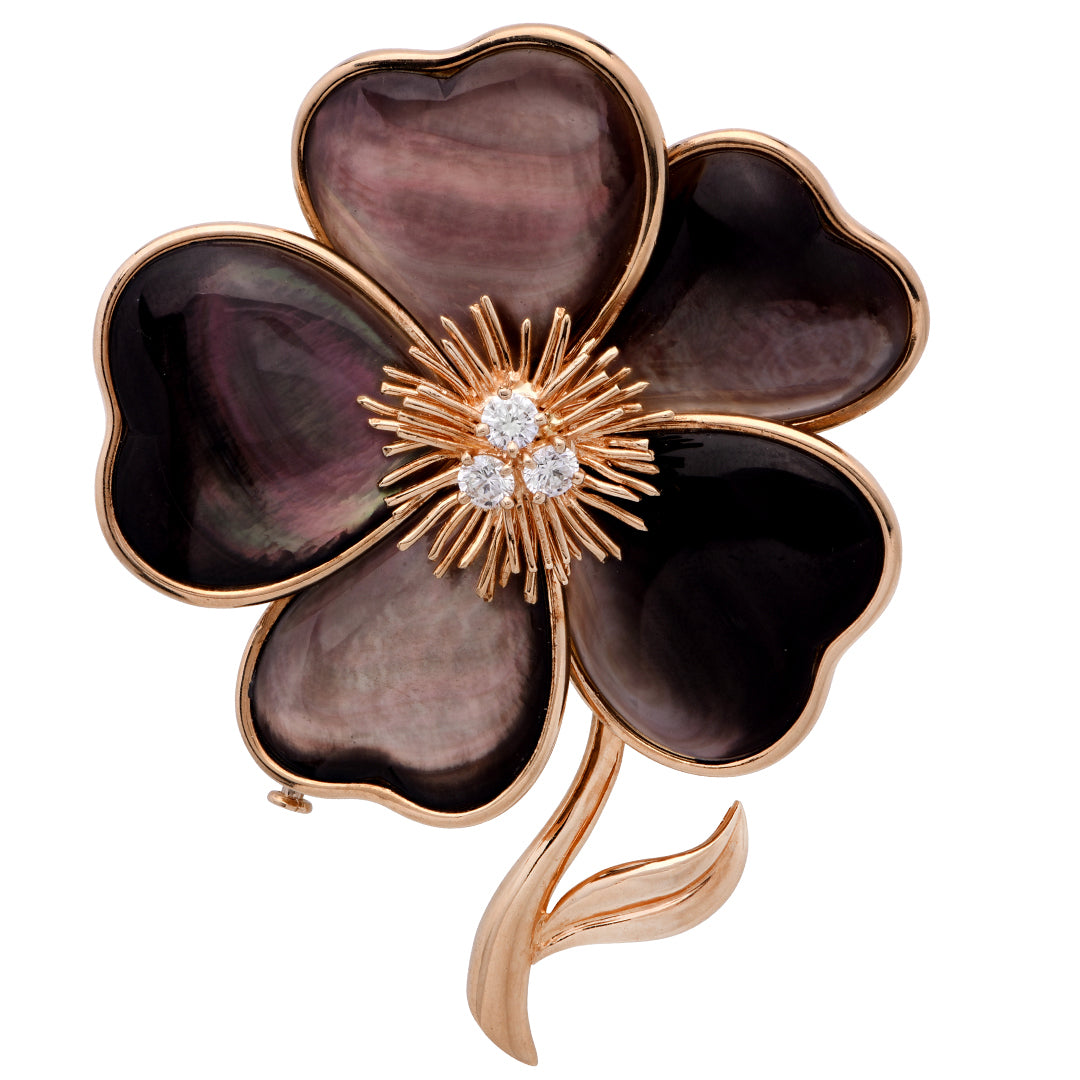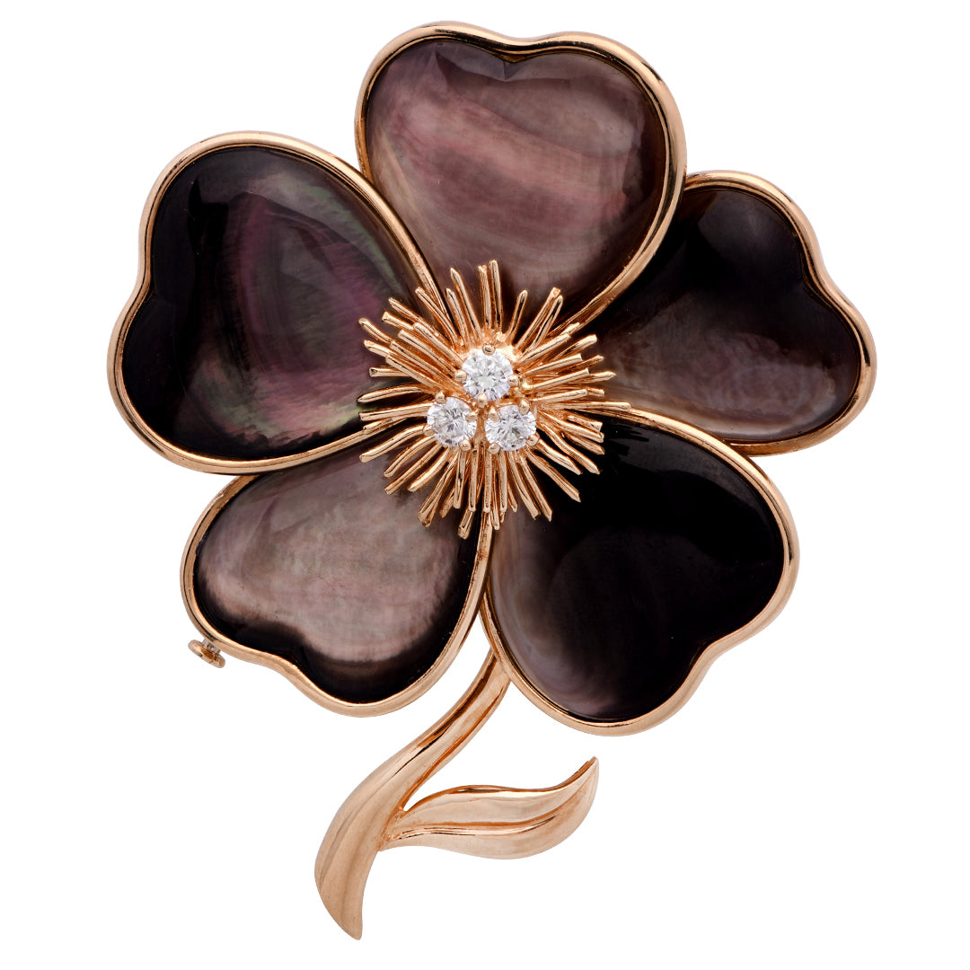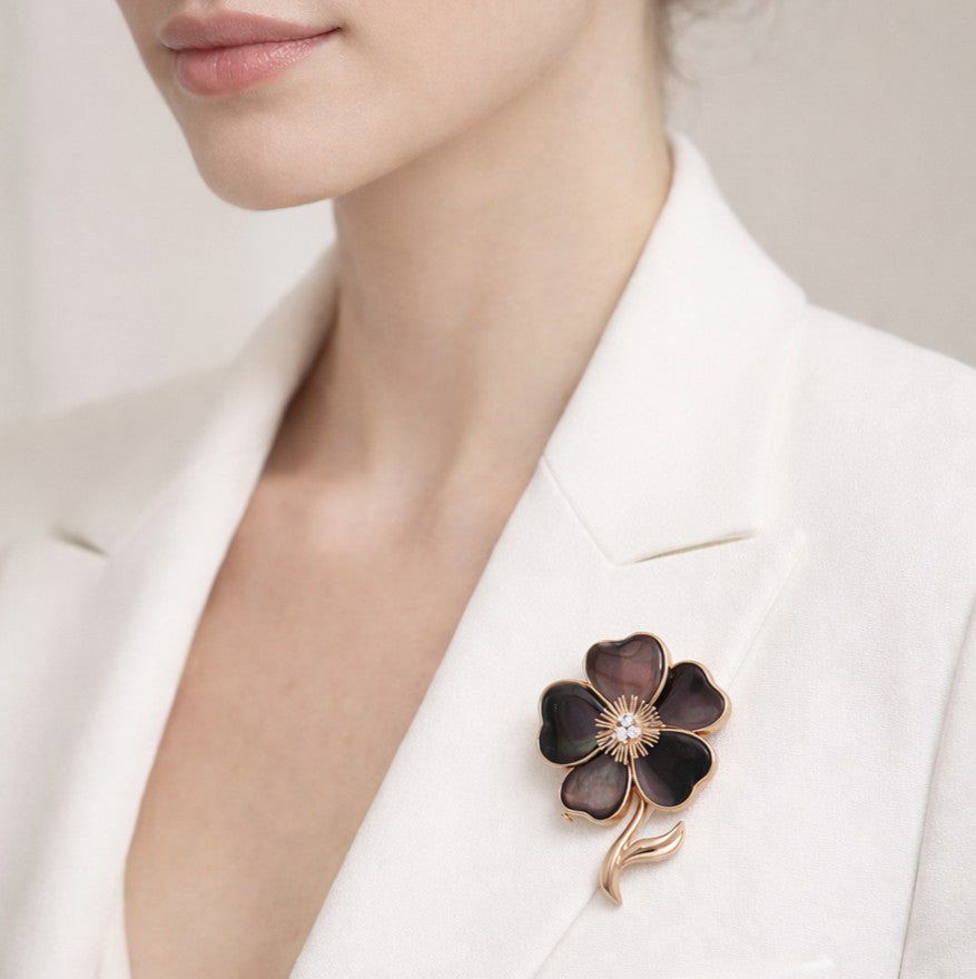 Coco's favorite flower, sans scent and thorns, signals purity of line. In costume pieces you'll see Gripoix glass or lacquered petals: in fine jewelry, sculpted 18k camellias pavé‑set with diamonds or carved from onyx and mother‑of‑pearl. The best versions balance negative space so they feel like a graphic emblem, not a literal bloom.