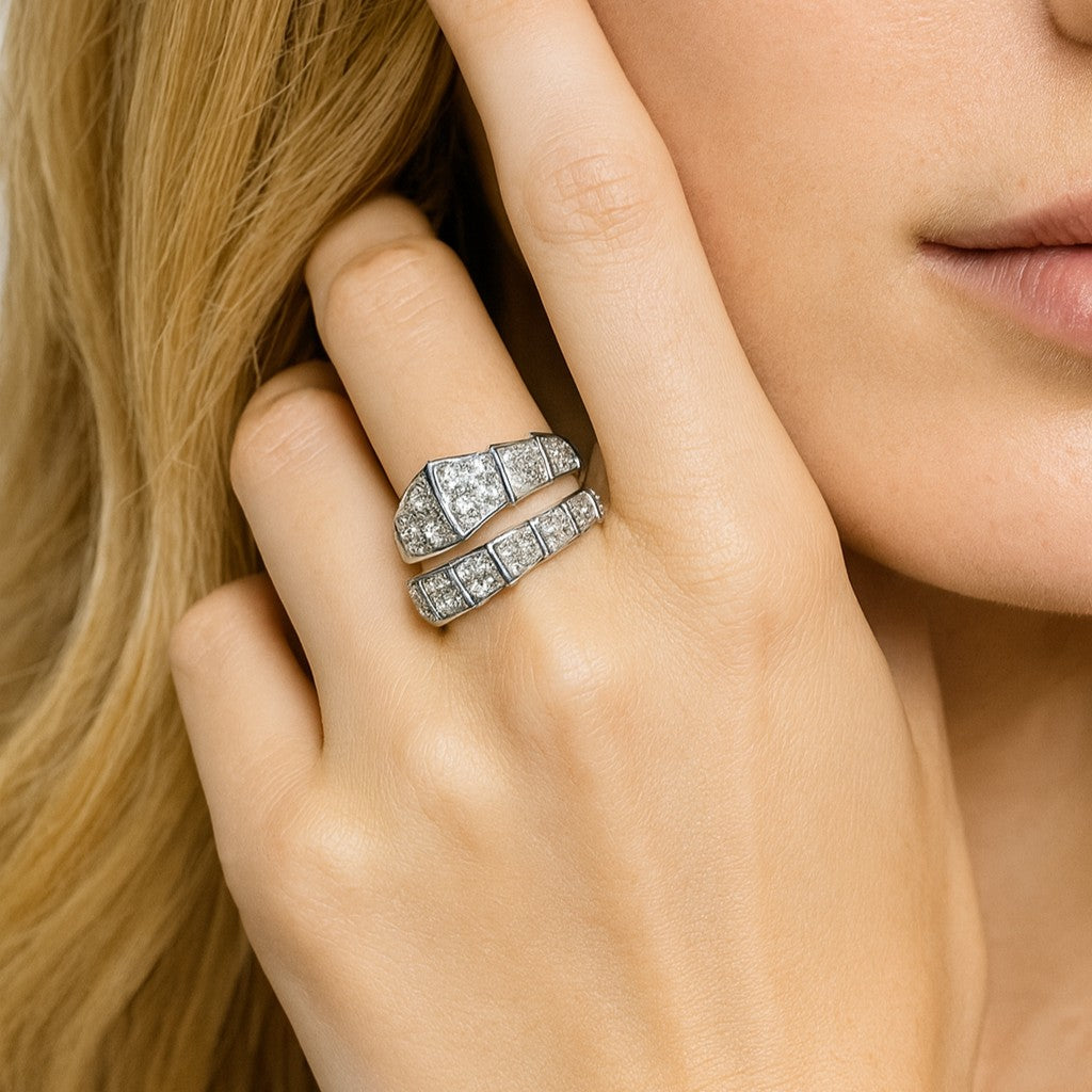 scaled geometry that wraps elegantly around the finger, capturing the Serpenti