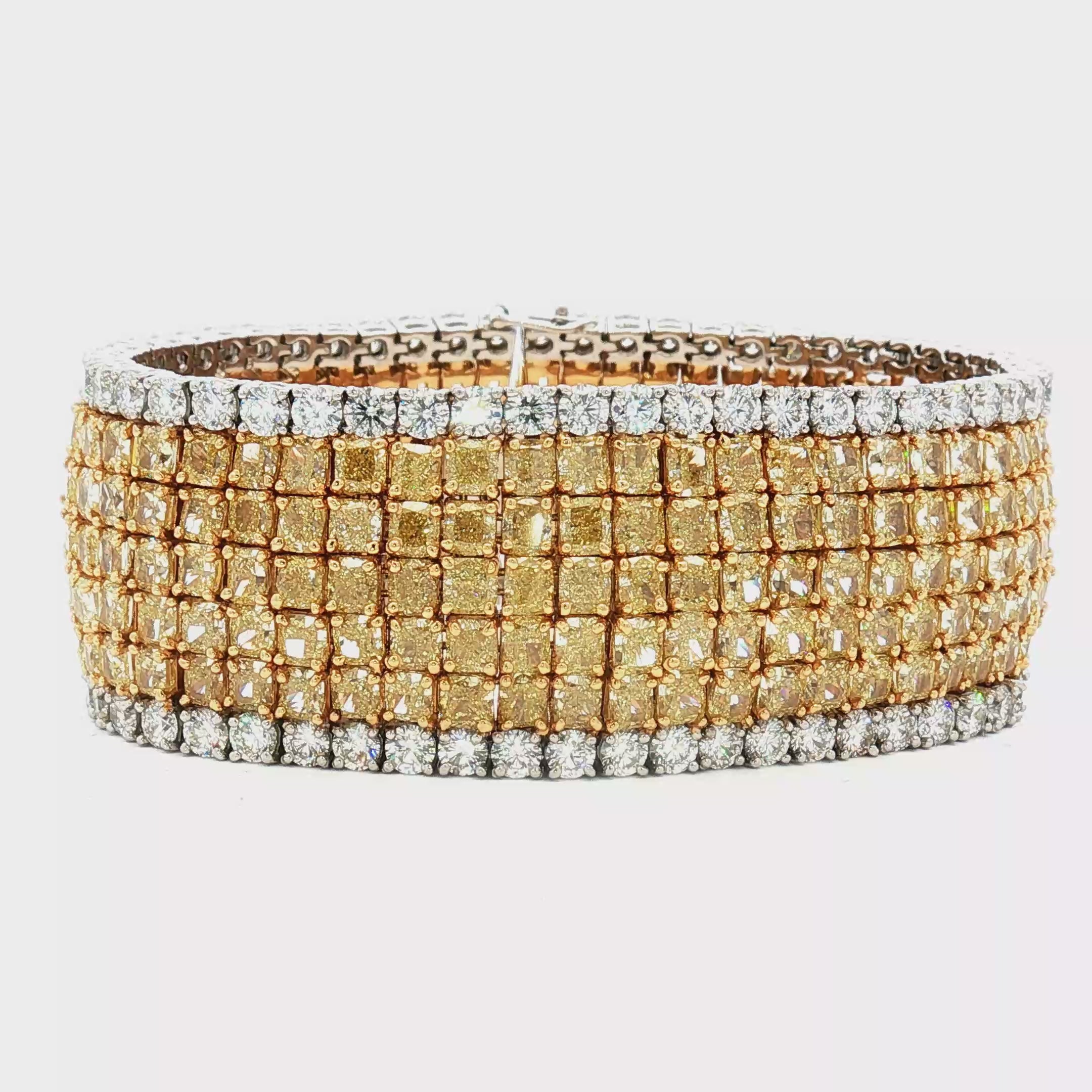The bracelet showcases 265 radiant-cut fancy yellow diamonds, totaling 64.32 carats, and 106 round brilliant white diamonds with a combined weight of 14.68 carats. Each diamond glistens in a harmonious blend of shades, ranging from light champagne to vivid canary, intricately set in a luxurious dual-metal combination of 18K yellow gold and platinum. This creates a remarkable contrast that enhances the bracelet's overall appeal and elegance.