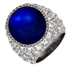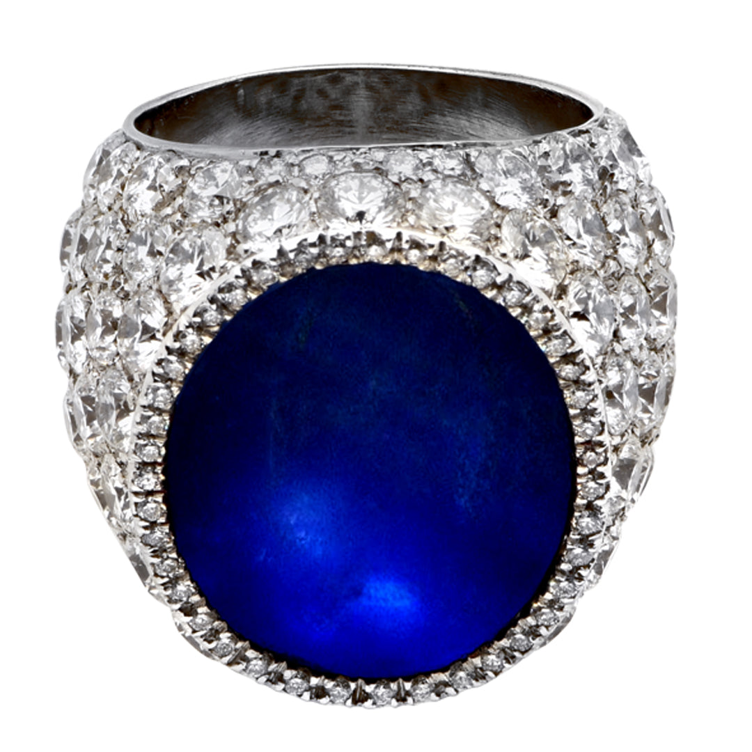 cabochon cut. Surrounding the vivid blue centerpiece are 120 round