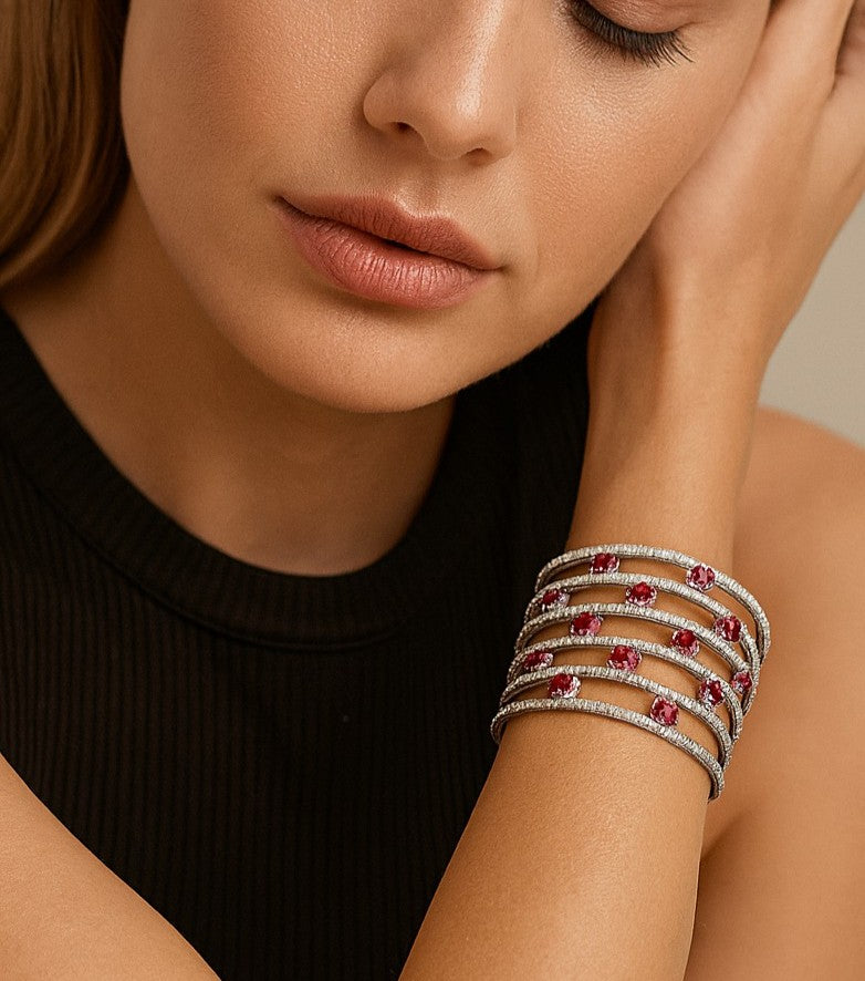 Expertly designed to showcase your individual style, the Diamond & Ruby Cuff Bangle Bracelet is more than just an accessory; it’s a symbol of sophistication and elegance. Don’t miss the chance to add this breathtaking piece to your jewelry box.