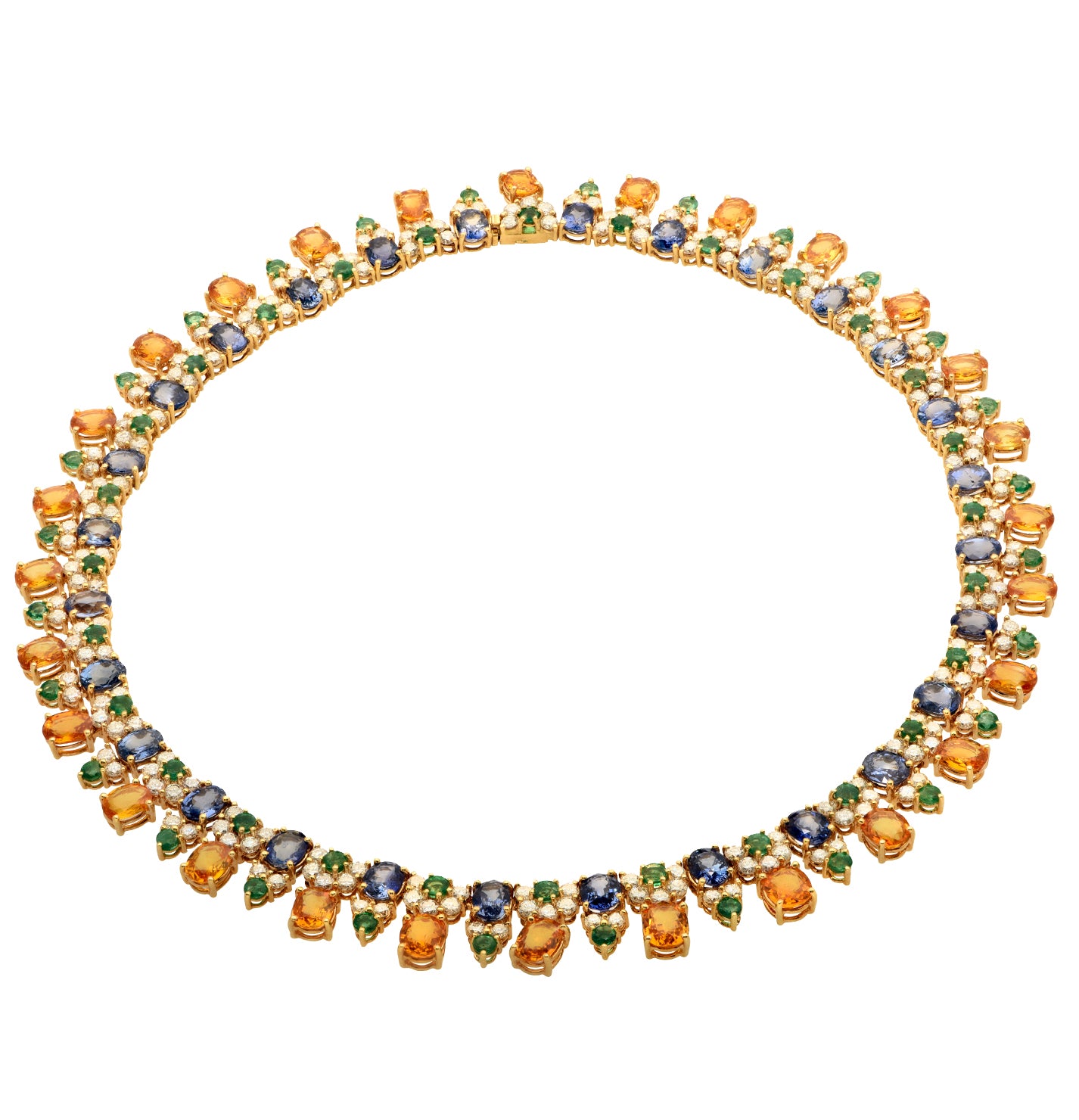 Expertly handcrafted in polished 18k yellow gold, each diamond and gemstone is meticulously set to enhance brilliance, color contrast, and fluid movement along the neckline. The precision and balance of this piece reflect exceptional attention to detail and high jewelry standards.