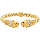 crafted in 18k yellow gold, the bangle features meticulous metalwork and