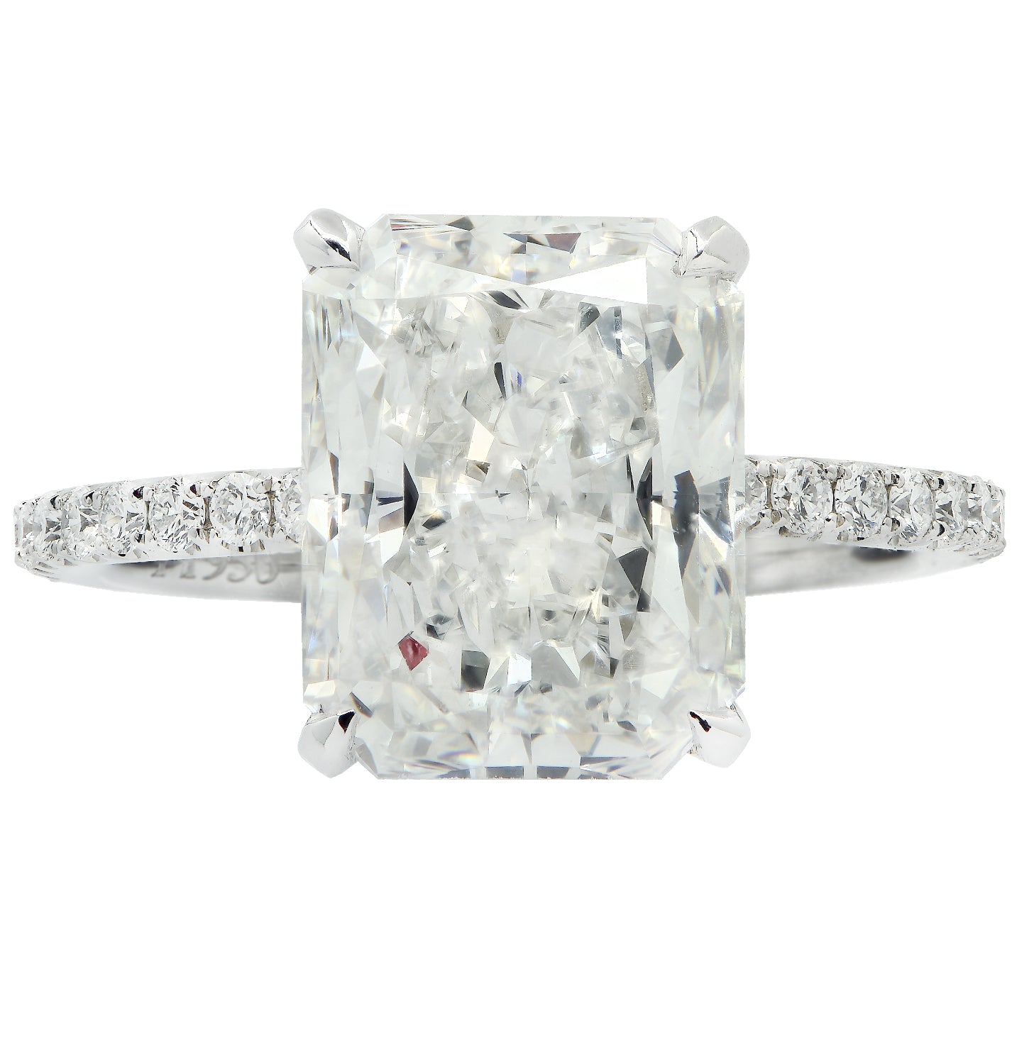 elegant platinum engagement ring features a stunning 5.05-carat radiant cut